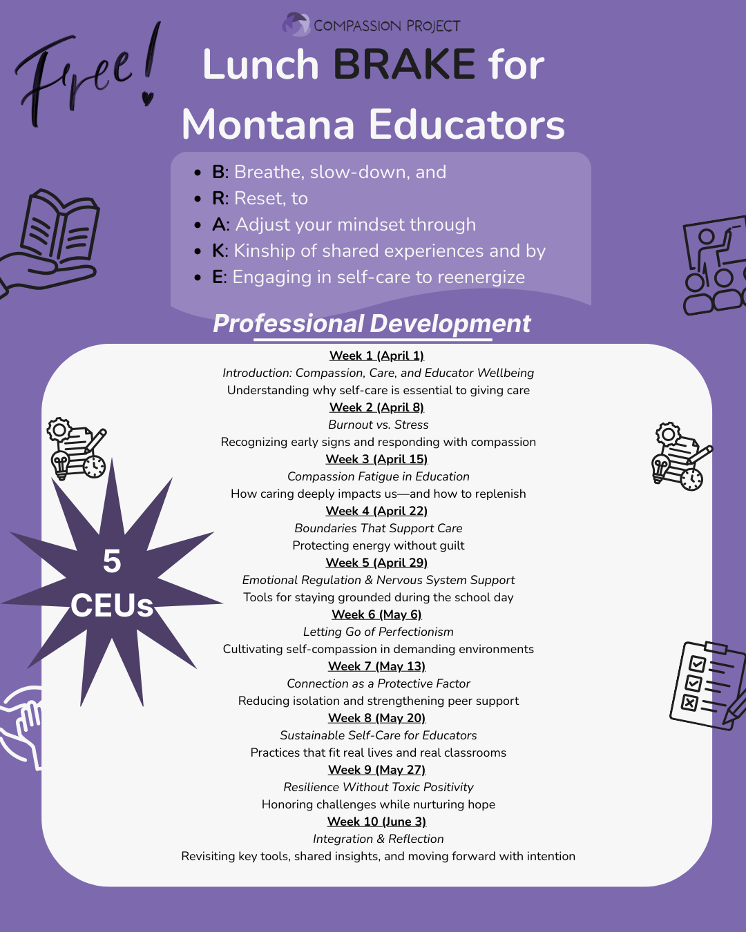 We hope guests take away strategies for filling their compassion bucket, connection with others in similar circumstances, and a deepened commitment to resourcing themselves and others in sustainable ways to enact long-term positive change.