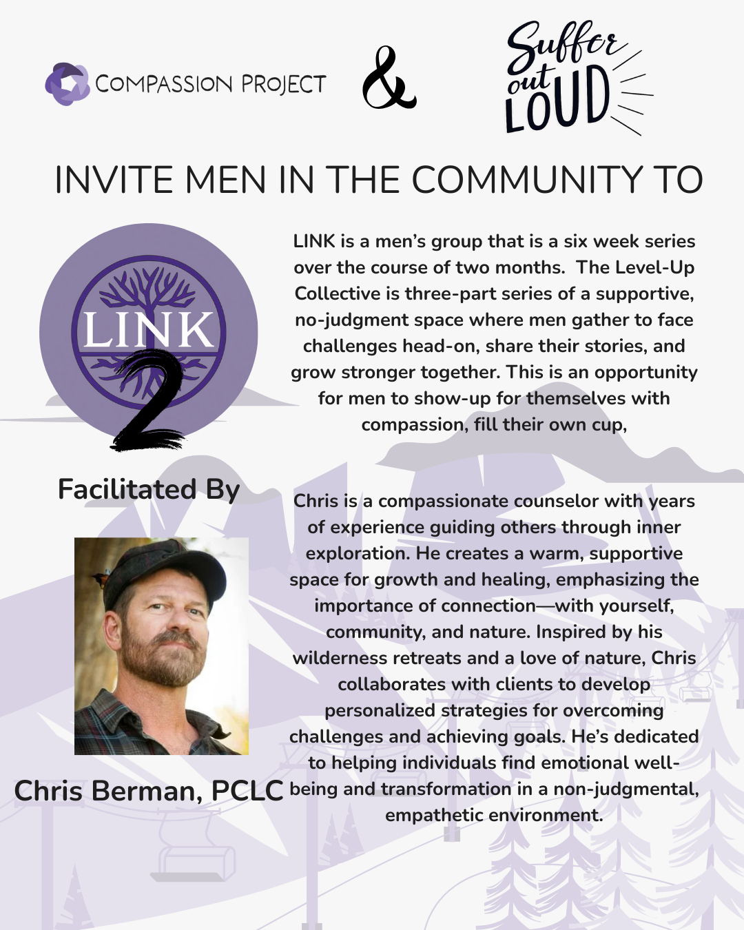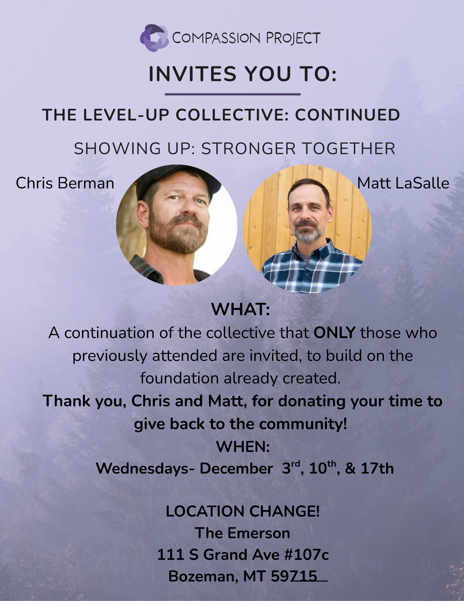 The Level-Up Collective is three-part series of a supportive, no-judgment space where men gather to face challenges head-on, share their stories, and grow stronger together. This is an opportunity for men to show-up for themselves with compassion, fill their own cup, build resilience, and create comradery with other like-minded men.